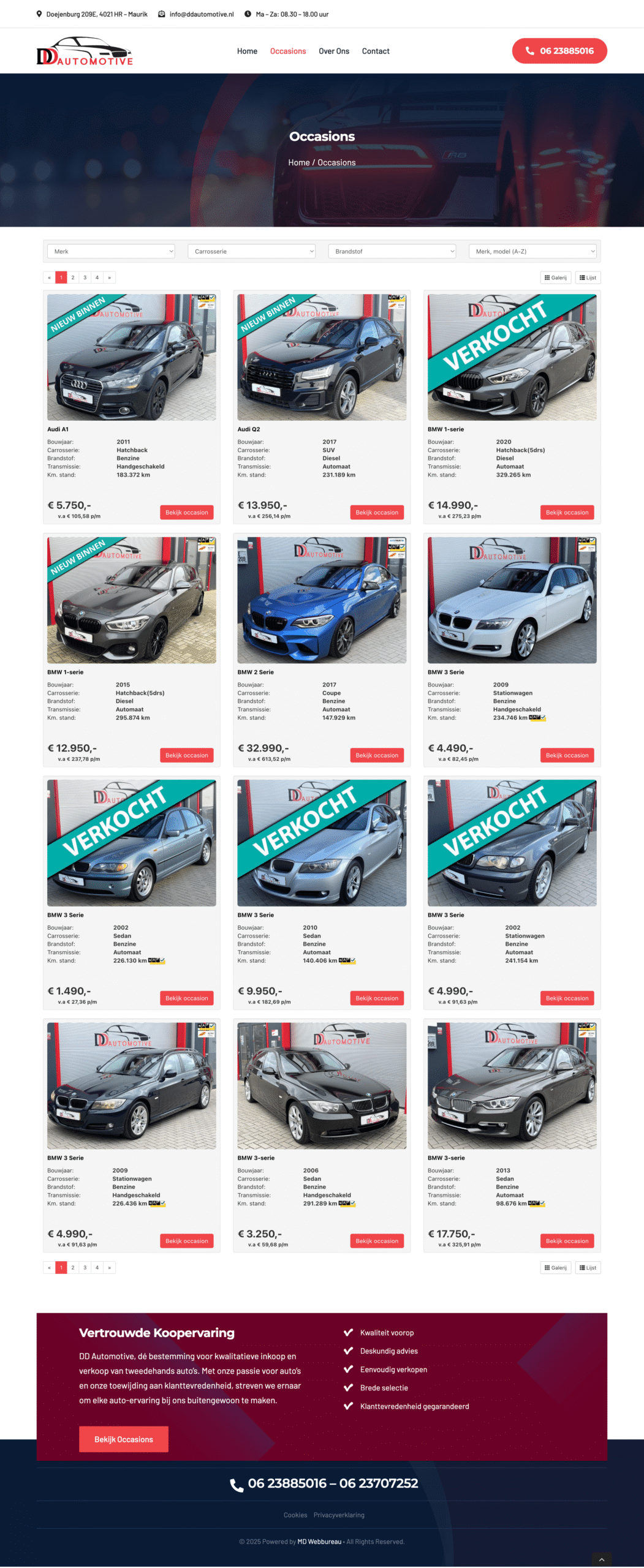 Daarom integreerden we een koppeling met VWE Automotive, waarmee het volledige occasionaanbod automatisch wordt gesynchroniseerd op de website. Nieuwe auto’s, prijswijzigingen of verkochte voertuigen worden realtime bijgewerkt, zodat bezoekers altijd het actuele aanbod zien. Daarnaast kunnen geïnteresseerden via externe platforms zoals Marktplaats eenvoudig worden doorgestuurd naar de eigen website waar DD Automotive zichzelf krachtig kan presenteren.