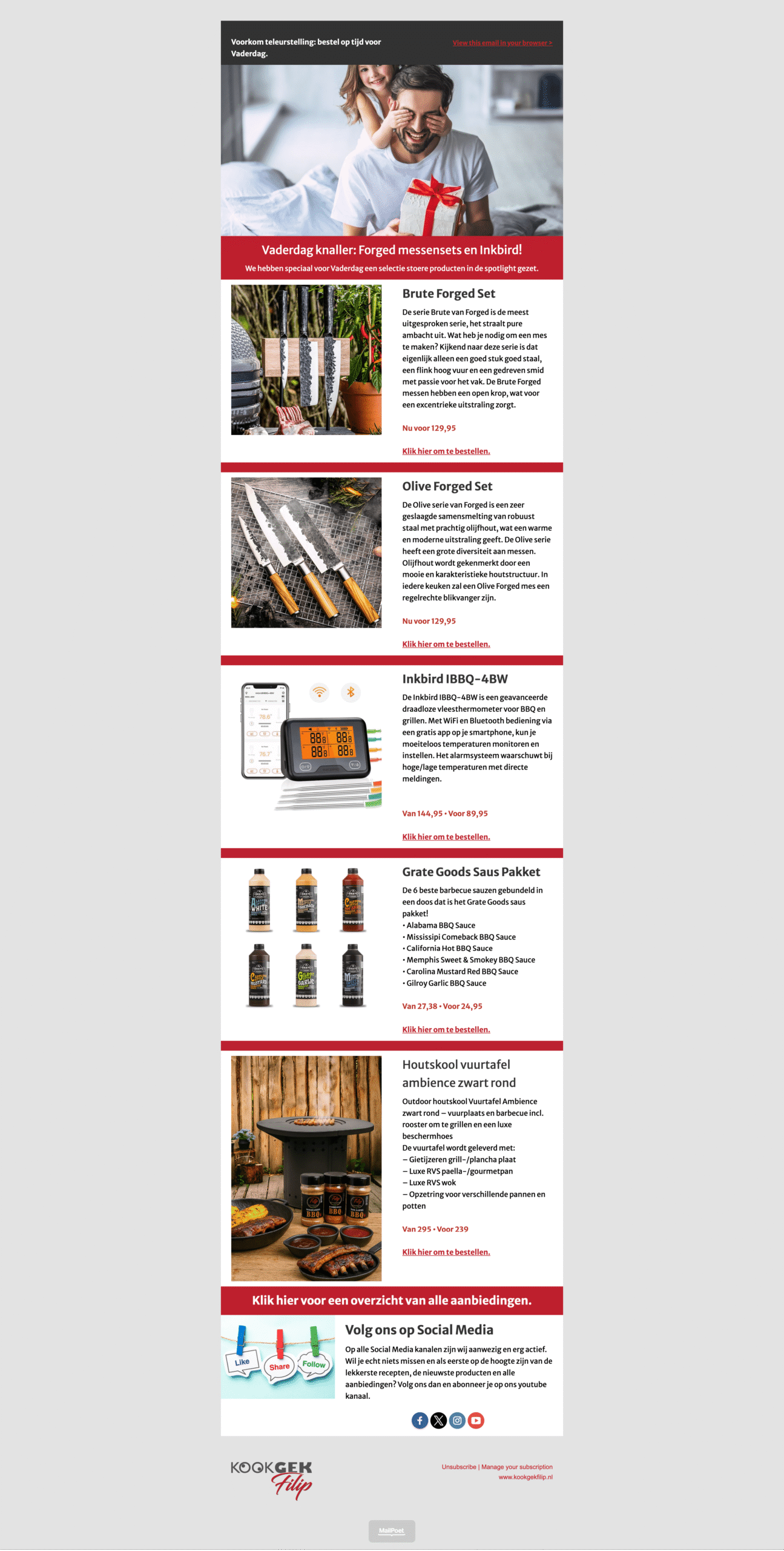 Voor Kookgek Filip, dé specialist in BBQ-recepten en -producten, verzorgt MD Webbureau sinds 2017 alles op digitaal terrein: van websitebouw (WordPress, WooCommerce) en Google Ads tot social media beheer en e-mailmarketing. We hanteren een gericht advertentiebudget van slechts enkele honderden euro per maand, maar zagen dankzij slimme targeting en conversiegerichte campagnes een gestage groei van verkeer, omzet en merksociale interactie.