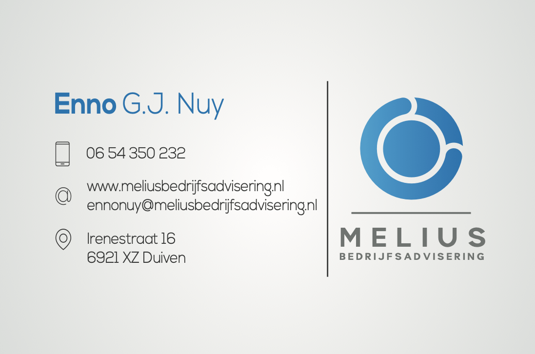 Voor Melius Bedrijfsadvisering ontwikkelden wij een professioneel logo en bijpassende visitekaartjes die aansluiten bij hun kernwaarden: betrouwbaarheid, helderheid en persoonlijke advisering.